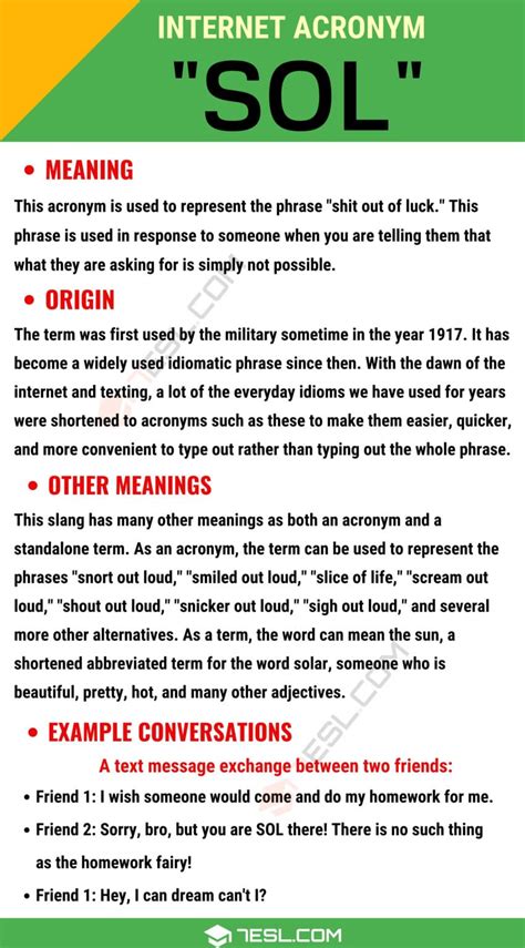 In conclusion, SOL is an abbreviation for "shit outta luck" and is commonly used among millennials and Gen Zers. It is an informal expression that should be used in the right context and with people who appreciate slang language. If you are uncomfortable using SOL, there are alternatives you can choose from, such as "out of luck" or "unfortunate."